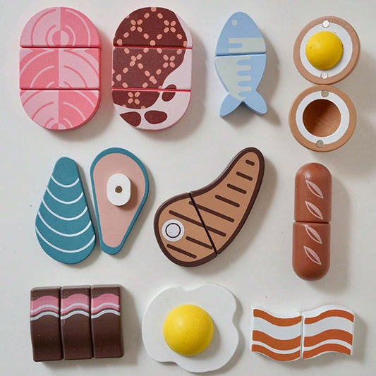 Conjunto Brinquedo De Carnes e Peixes De Faz De Conta - Madeira